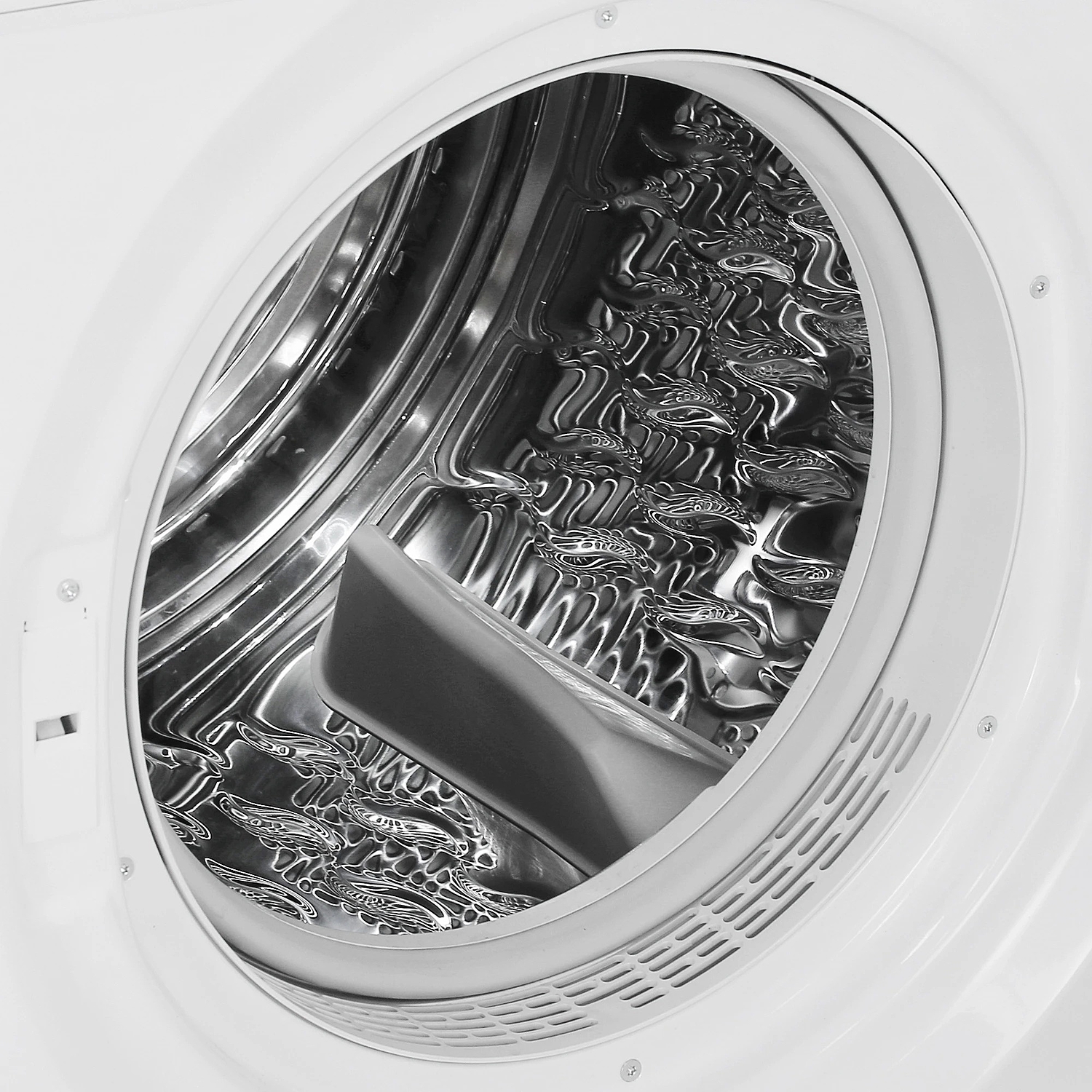 Дизайн выполнен в классическом белом цвете, загрузочный люк черного цвета придает ей современный и стильный вид. Барабан из нержавеющей стали с системой реверсивного вращения обеспечивает равномерное и бережное сушку белья. Внутреннее освещение барабана позволяет легко контролировать процесс сушки и не пропустить ни одну вещь при выгрузке.