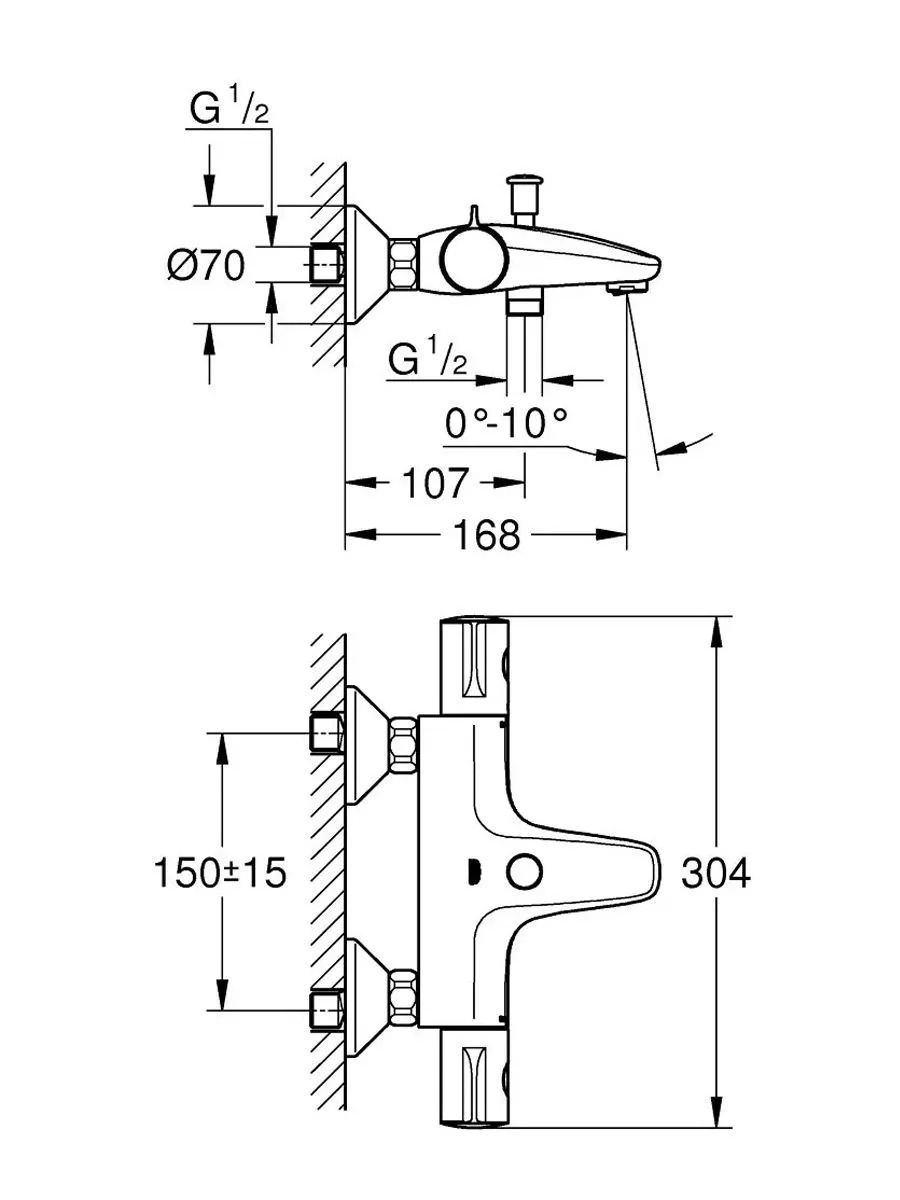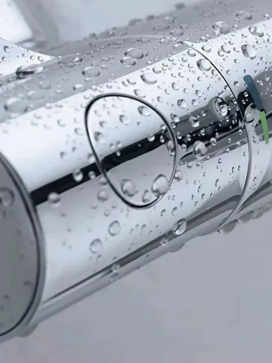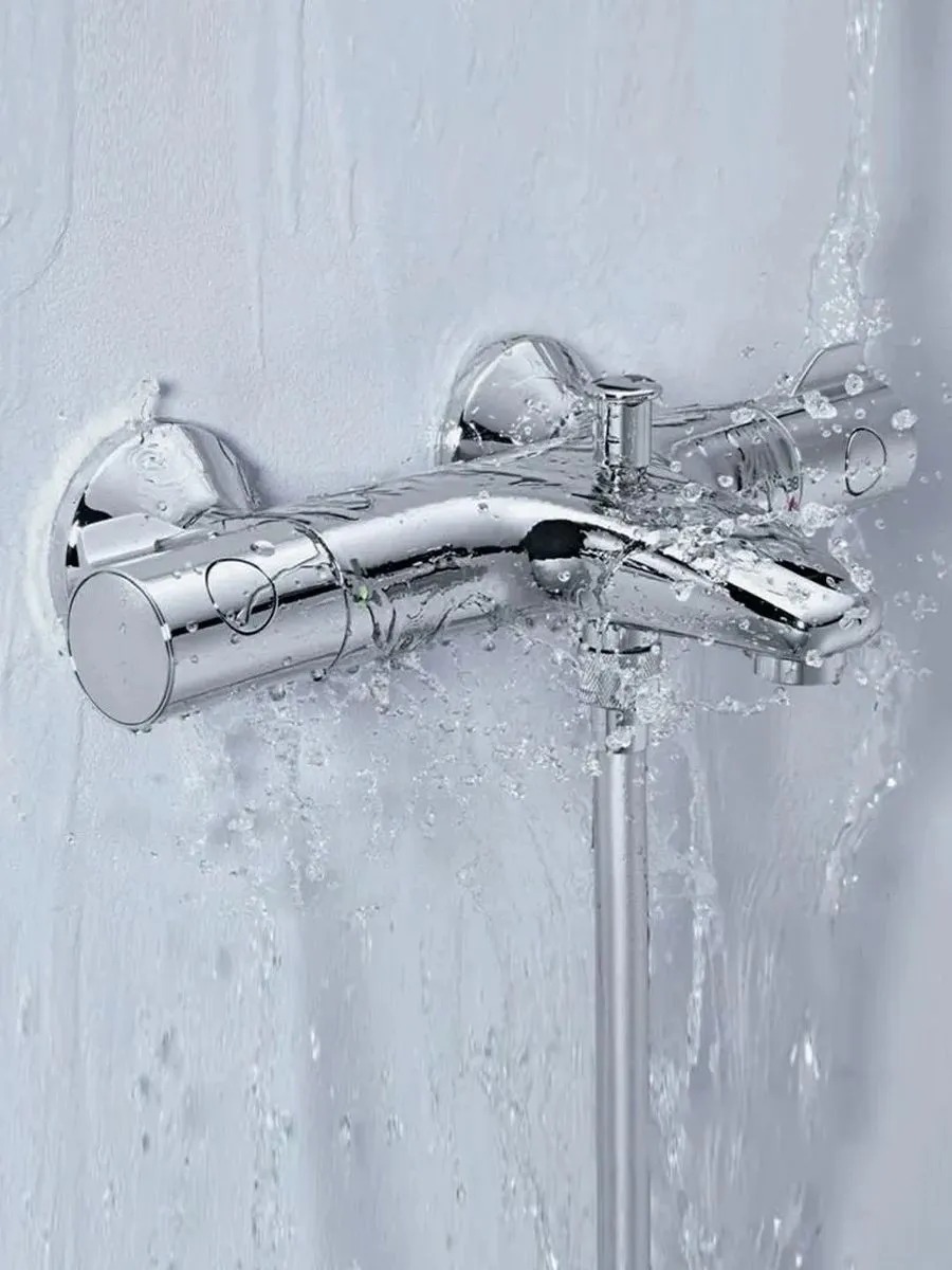 Термостат для ванны GROHE Grohtherm 800 (артикул 34567000) в хромированном исполнении — это смеситель для ванны с душем с настенным монтажом, оснащённый термостатическим механизмом для точной регулировки температуры и напора воды плавным поворотом рукояток. В основе работы — технология GROHE TurboStat®, которая обеспечивает мгновенную подачу воды с заданными параметрами и поддерживает их на протяжении всего времени использования, реагируя на колебания давления в системе вдвое быстрее аналогов. Для безопасности предусмотрен стопор, срабатывающий при превышении температуры 38∘ C, — это защищает от внезапных ожогов. Экономия воды реализована за счёт технологии GROHE EcoJoy® (позволяет сократить расход до 50 % без ущерба для качества потока) и кнопки GROHE EcoButton на рукоятке напора с индивидуально настраиваемым стопором расхода. Регулируемый аэратор на изливе смешивает воду с воздухом, делая струю мягкой и объёмной. Корпус изготовлен из устойчивой к коррозии латуни, а фирменное покрытие GROHE StarLight® отличается износостойкостью — оно устойчиво к царапинам и загрязнениям, долго сохраняет блеск и легко очищается мягкой салфеткой. В конструкцию входят: автоматический переключатель «ванна/душ», керамический вентиль 21″ с углом поворота 180°, отвод для душа снизу 21″, скрытые S‑образные эксцентрики, металлическая розетка, встроенные обратные клапаны и грязеулавливающие фильтры.