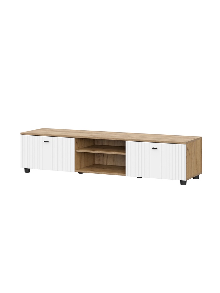 Стильное и практичное решение для гостиной. За счёт универсальной конструкции тумба может устанавливаться как на опорах, так и подвешиваться на стену с помощью навесов. Продуманное внутреннее пространство с открытой нишей и секциями за дверцами позволяет удобно разместить мультимедийную технику, аксессуары и предметы интерьера.