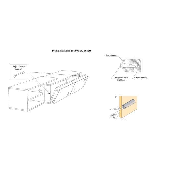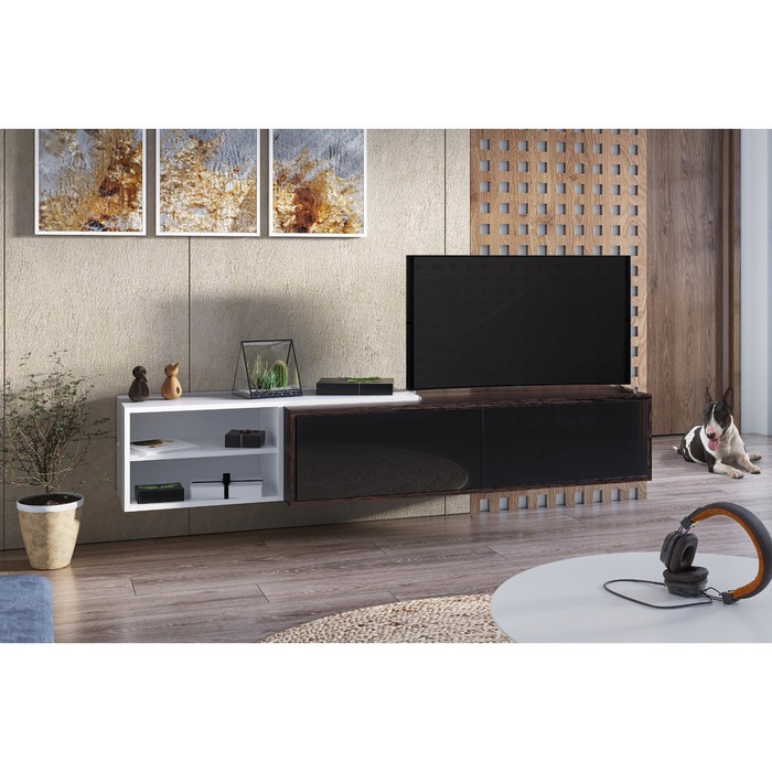 Тумба под ТВ подвесная №1, 1800х420х320, Белый глянец/Венге/Черное стекло