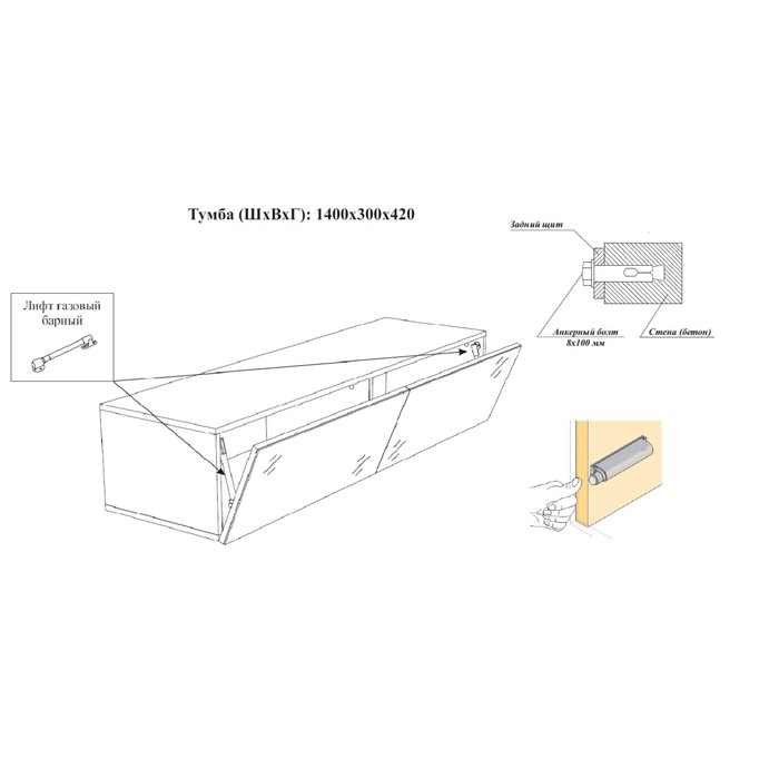 Тумба под ТВ подвесная №3, 1400х420х300 – это отличное решение для современного интерьера. С подвесной тумбой можно легко навести порядок в доме, ведь под ней легко будет проходить даже робот-пылесос, и в вашей гостиной всегда будет чисто и свежо. Для крепления к стене идет 3 анкерных болта. Полка выдерживает до 25 кг. Дверки открываются с помощью механизма push-to-open, нажимая на фасад изделия. Фасад тумбы изготовлен из ЛДСП, на который наклеивается стекло лакобель.