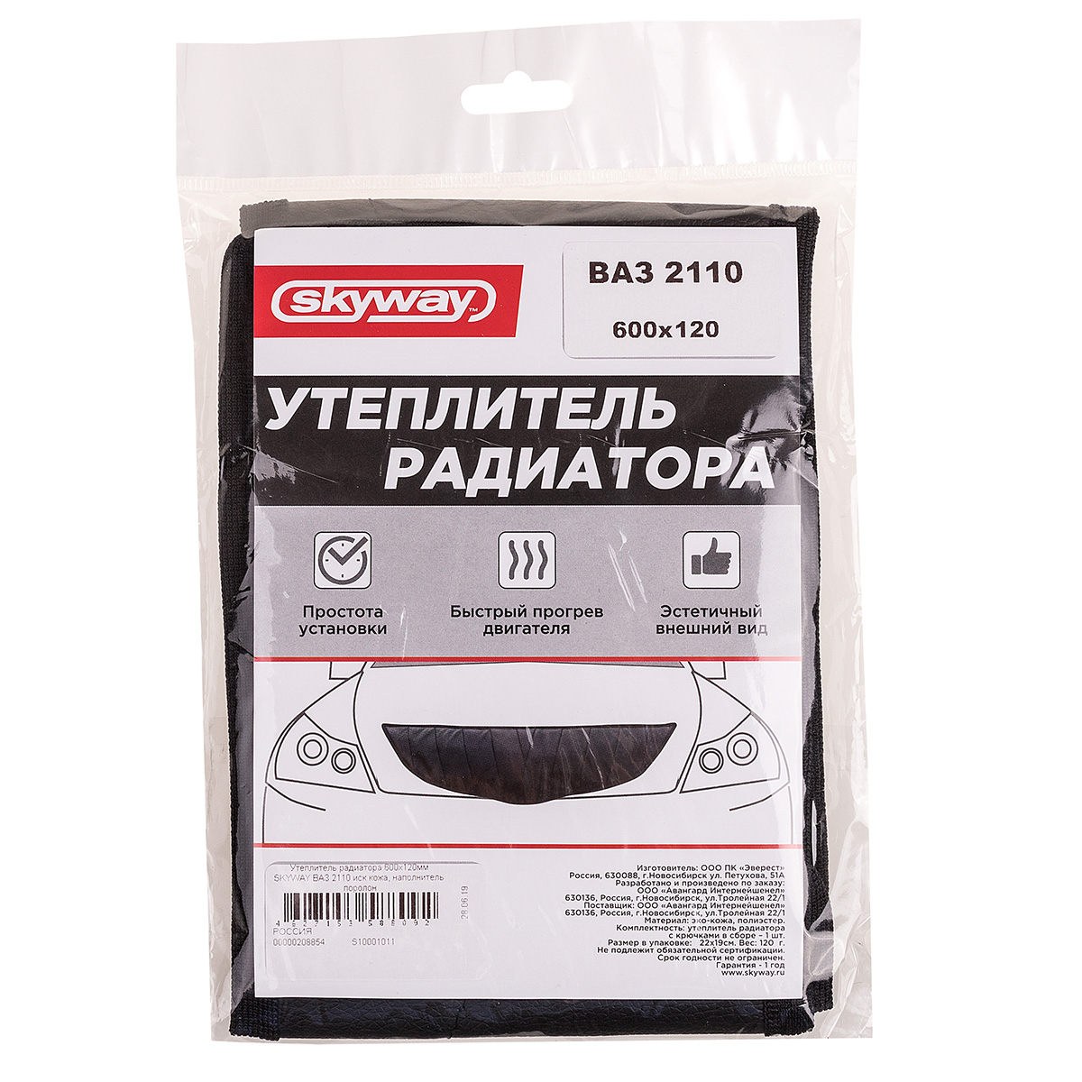 Утеплитель радиатора 600х120мм Skyway для S10001011 ВАЗ 2110 иск кожа, наполнитель поролон - является оптимальным решением для каждого автовладельца с целью сохранения температурного режима двигателя автомобиля при эксплуатации в холодное время года. Технически его просто и легко установить на решетку радиатора и зафиксировать. По физическим свойствам - наличие на решетке радиатора значительно сокращает проникновение потока холодного воздуха в подкапотное пространство, тем самым ускоряет процесс нагрева двигателя и позволяет поддерживать рабочую температуру во время движения автомобиля в зимний период. Универсальная система креплений в виде резинок и крючков позволяет надежно зафиксировать изделие, идеально повторяя контуры решетки радиатора. Все швы, внутренние и внешние, обработаны на оверлоке. Конструктивно изделие выполнено в 3 слоя. Верхний слой материала - искусственная кожа, нижний слой материала - плотный нетканый материал. Наполнитель - поролон толщиной в 2 мм. И все это сочетается в одном изделии! Характеристики: Размер - 600*120 мм. Для автомобиля - ВАЗ 2110. Материал - искусственная кожа. Наполнитель - поролон. Цвет - черный. Крепление: 4 крючка.
