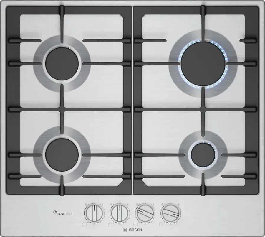 Газовая варочная панель Bosch PCP6A5I90M оснащена четырьмя конфорками разной мощности, оптимально распределённые для комфорта: передняя левая и задняя левая по 1.75 кВт, передняя правая 1 кВт, а задняя правая — форсированная с мощностью 3 кВт; суммарная отдача всех горелок достигает 7.5 кВт, что позволяет одновременно готовить несколько блюд без потери эффективности. Конструкция решёток выполнена из чугуна, они надёжно фиксируют посуду и выдерживают большие тепловые нагрузки, при этом удобны для перемещения и очищения. Поворотные элементы управления просты в использовании: интуитивно понятные ручки обеспечивают плавную регулировку, девять ступеней мощности дают точный контроль над интенсивностью пламени и соответствуют самым разным рецептам — от томления до быстрого кипячения.