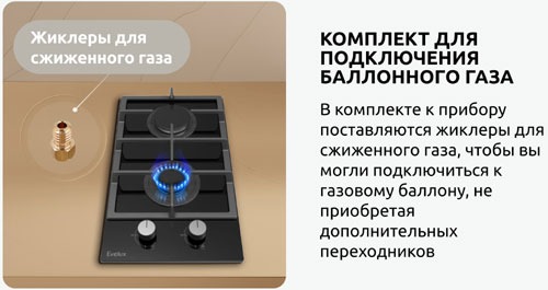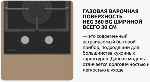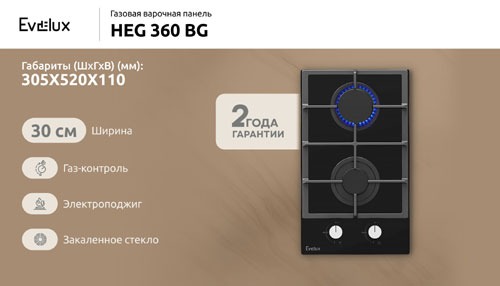 Эффективность и экономичность Благодаря двум конфоркам различного размера, EVELUX HEG 360 BG позволяет эффективно использовать энергию. Меньшая конфорка идеально подходит для небольших кастрюль и сковородок, а большая — для крупной посуды, что помогает экономить газ и время приготовления.