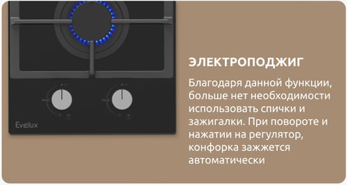 Электроподжиг Электроподжиг позволяет легко и быстро зажечь конфорки без необходимости использования спичек или зажигалок. Это не только удобно, но и повышает безопасность, так как исключает риск ожогов при поджигании.