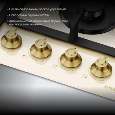Газовая варочная панель Hyundai HHG 6434 BE: стиль, мощность и удобство на вашей кухне. Ее можно использовать как в обычной квартире, так и на даче (для этого в комплект входят жиклеры для сжиженного газа).
