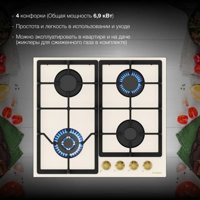 Четыре конфорки с газ-контролем: Прочные и надежные одноконтурные газовые конфорки помогут вам готовить на разных уровнях мощности, обеспечивая равномерное прогревание продуктов.