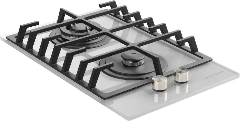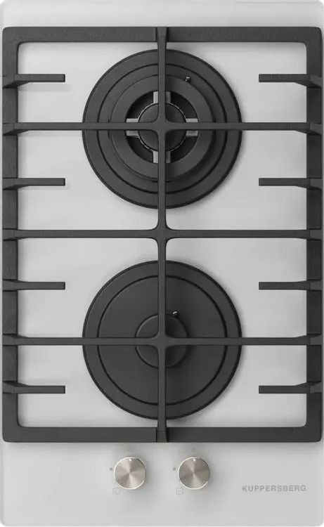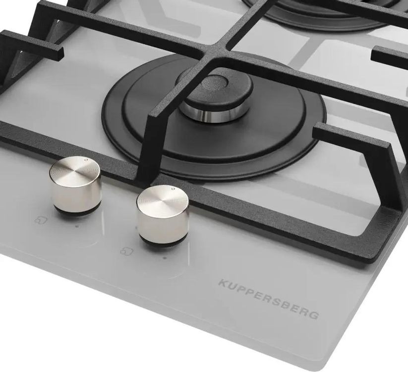 Газовая варочная поверхность Kuppersberg FG 33 W с панелью из закаленного стекла оснащена двумя конфорками с устойчивыми чугунными решетками. Газ-контроль автоматически отключает подачу газа при потухании огня. Встроенный электроподжиг высекает искру при включении поворотного регулятора и позволяет включать конфорки без помощи спичек и зажигалки.
