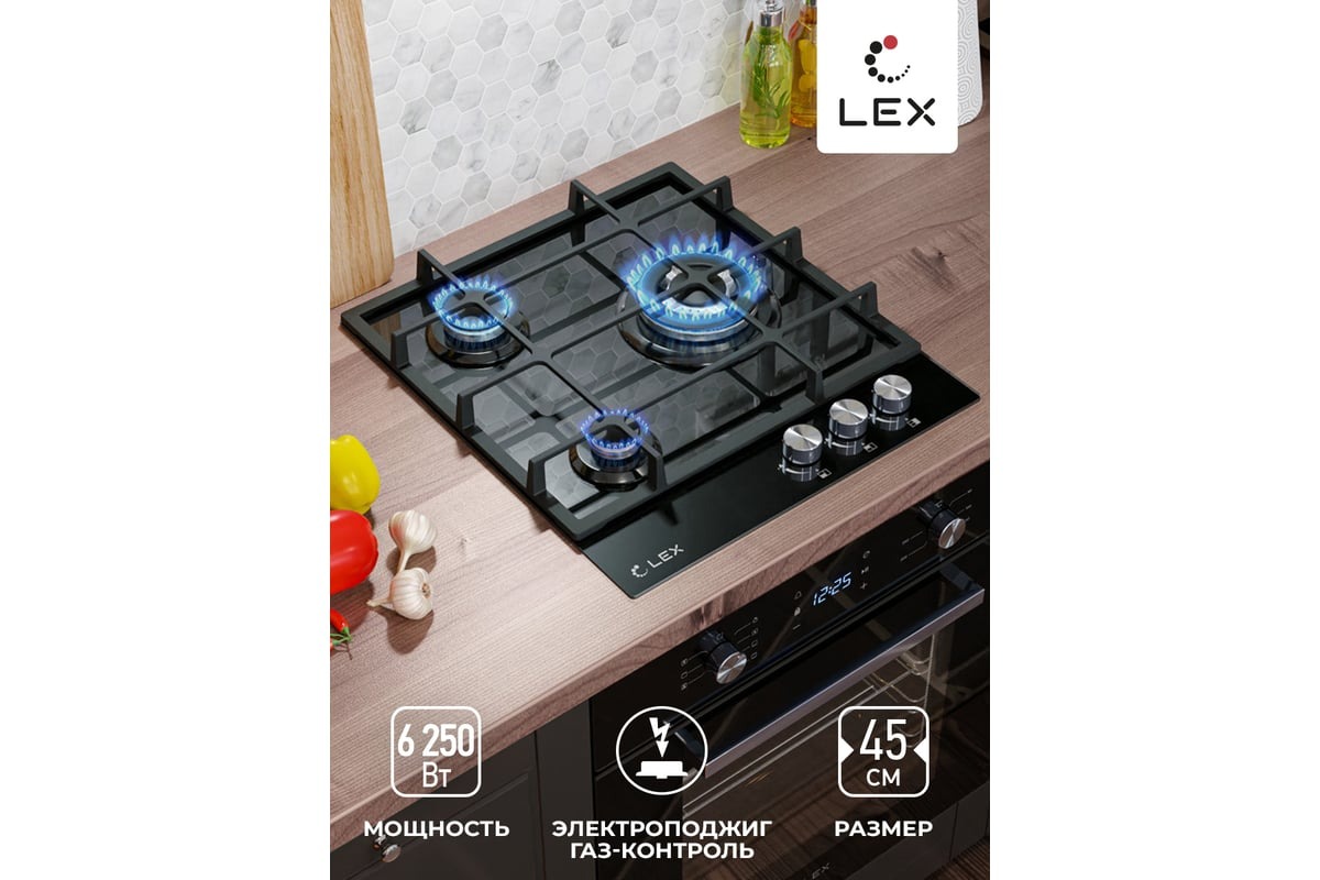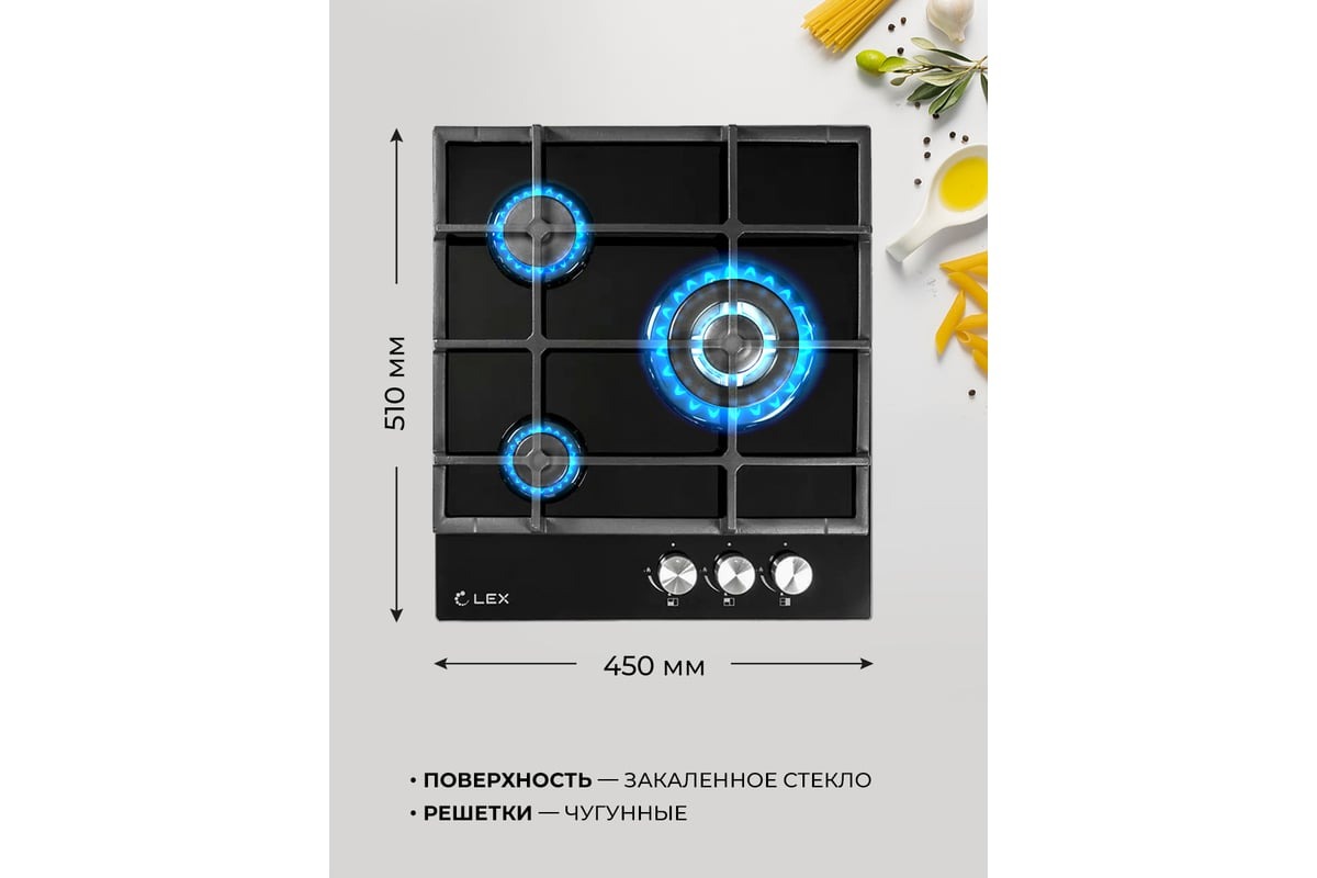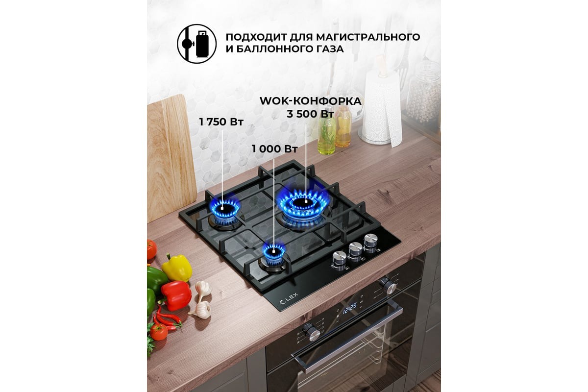 Изготовлена из закаленного стекла лаконичного черного цвета и снабжена чугунными решетками. В модели используется механическое управление. Панель оснащена 3 конфорками, одна из которых WOK с тройным рядом пламени для приготовления блюд азиатской кухни. Панель также имеет конфорку быстрого нагрева, электроподжиг и газ-контроль, прекращающий подачу газа, когда пламя случайно гаснет. Подходит для магистрального и баллонного газа.