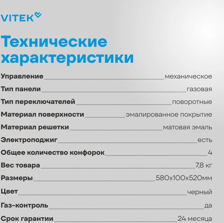 Газовая варочная поверхность Vitek VGH 6410W MBK создана для тех, кто ищет сочетание мощности, безопасности и практичности. Ширина панели 60 см позволяет готовить на 4 конфорках одновременно, сохраняя удобство и свободу размещения посуды. Поверхность выполнена из эмалированной стали с матовым покрытием, устойчивым к следам использования, а решетка из прочной эмали надежно удерживает сковороды и кастрюли разного диаметра.