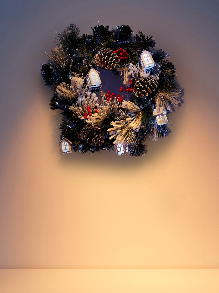 Фиброоптический венок диаметром 50 см украшен зелёной ПВХ-хвоей и разноцветными деталями, включая шишки и ягоды. Восемь режимов подсветки создают эффект мерцающего снега, оживляя интерьер и создавая атмосферу зимнего праздника. Отгибающиеся ветки позволяют легко разместить венок на двери, окне или стене.
