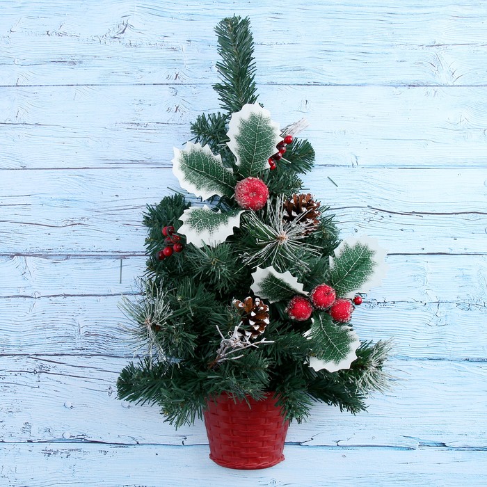 Пушистые веточки, шишки, припорошенные снежком, и веточки рождественской омелы создадут новогоднее настроение. Такую ель не нужно украшать – она уже нарядная. А благодаря аккуратному горшочку, в который помещена ёлочка, она станет прекрасным украшением любого интерьера.
