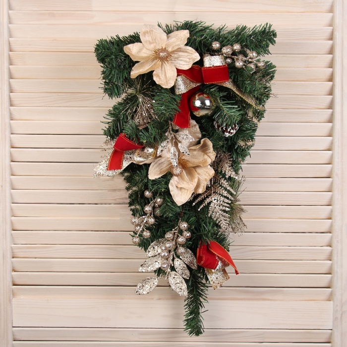 Принесите волшебство зимы в ваш дом! Настенная ёлка «Зимнее волшебство. Магнолия золотая» - это уникальное сочетание классики и современного дизайна, которое станет изюминкой вашего интерьера. Компактный размер (60×34 см) и гибкие ветки из ПВХ позволяют создать идеальный праздничный декор без лишних хлопот.