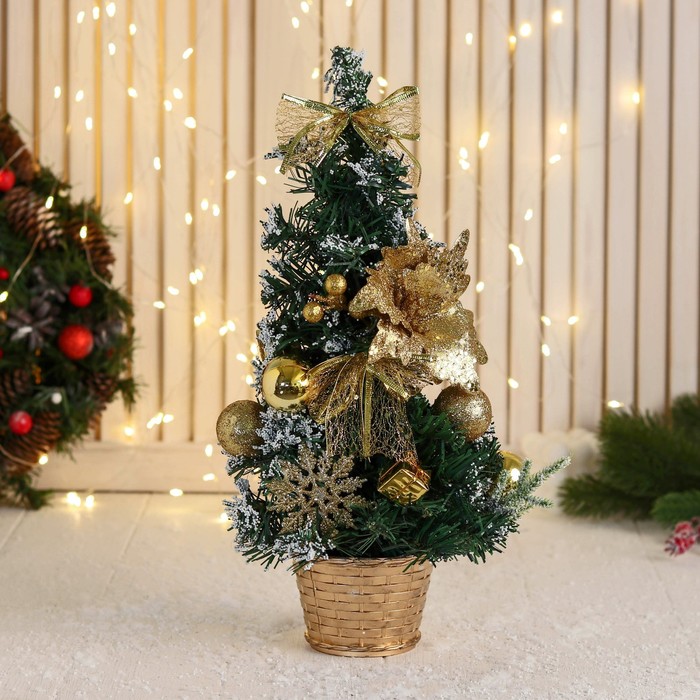 Настольная ёлка «Праздничная золотая», 39 см, с декором — это тёплый и объёмный акцент для новогоднего убранства. Искусственная модель высотой 39 см выполнена из мягких ПВХ-веток с отгибающимся креплением, имеет зелёную хвою и украшения золотого цвета — элемент оформления в стиле новогоднего барокко для тех, кто ценит свет, текстуру и атмосферу праздника в мини-формате.