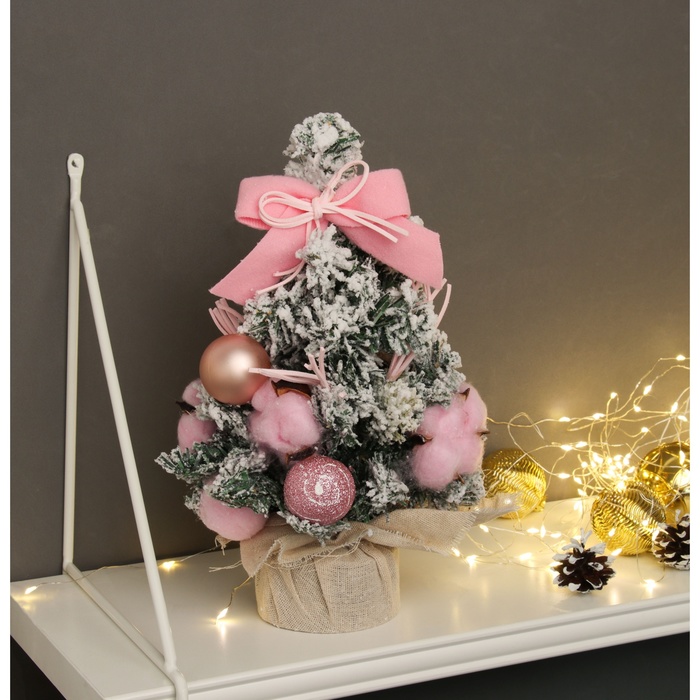 Настольная ёлка высотой 31 см с отгибающимися ПВХ ветками сочетает белую и зелёную хвою с нежным розовым декором. В стиле шебби-шик она привносит мягкость и уют в праздничное оформление.