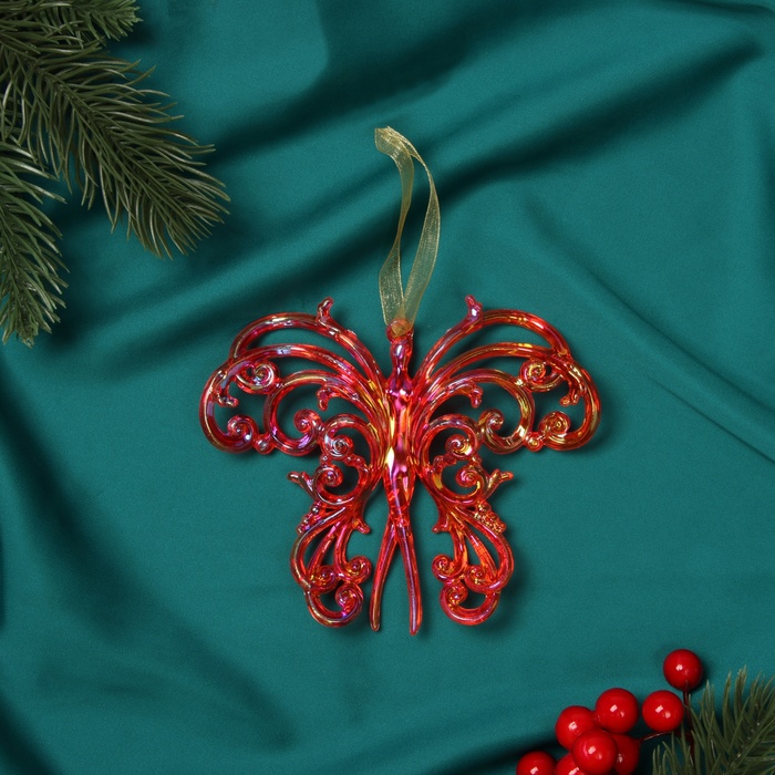Ёлочная игрушка в виде резной красной бабочки с переливом станет изысканным акцентом в новогоднем оформлении. Её форма и стиль новогоднего барокко придают декору глубину и праздничное настроение.
