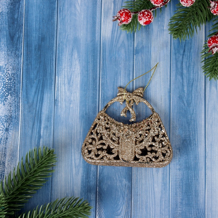 Украшение в виде сумочки добавляет нотки утончённости и праздничного настроения. Его золотистый оттенок гармонирует с другими элементами декора, создавая ощущение торжественности и тепла зимних праздников.