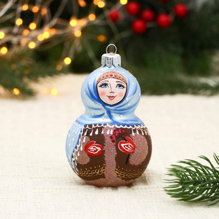 Ёлочное украшение «Русская красавица», 10 см, стекло, голубое с росписью — это тёплое и аутентичное дополнение к новогоднему декору. Фигурка в образе Снегурочки или матрёшки подходит для ёлки, подарочной композиции или интерьерного акцента — душевное решение для тех, кто ценит традиции, народный колорит и атмосферу настоящего праздника без излишеств.