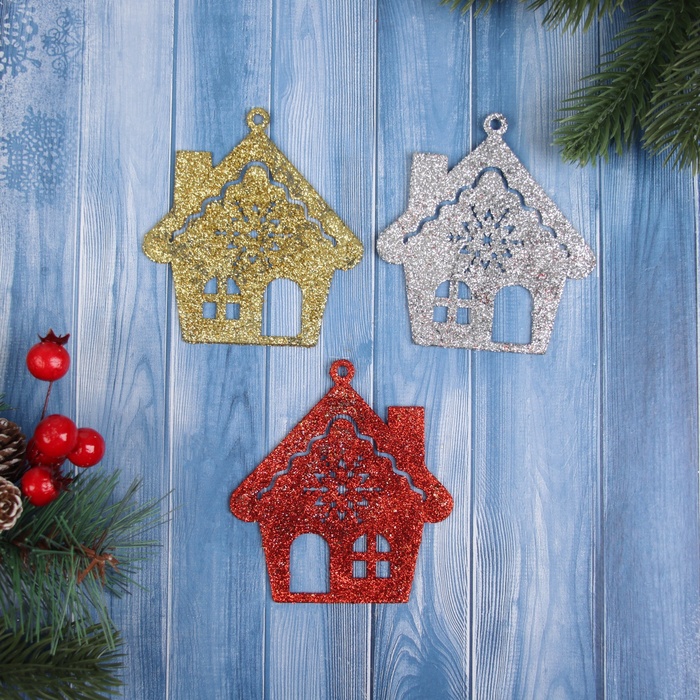 Набор из трёх ёлочных украшений в форме домиков с резным узором снежинок добавит традиционный шарм новогоднему оформлению. Игрушки размером 9×8 см изготовлены из пластика и выполнены в стиле новогоднего барокко, подчёркивая изящество и праздничную атмосферу.