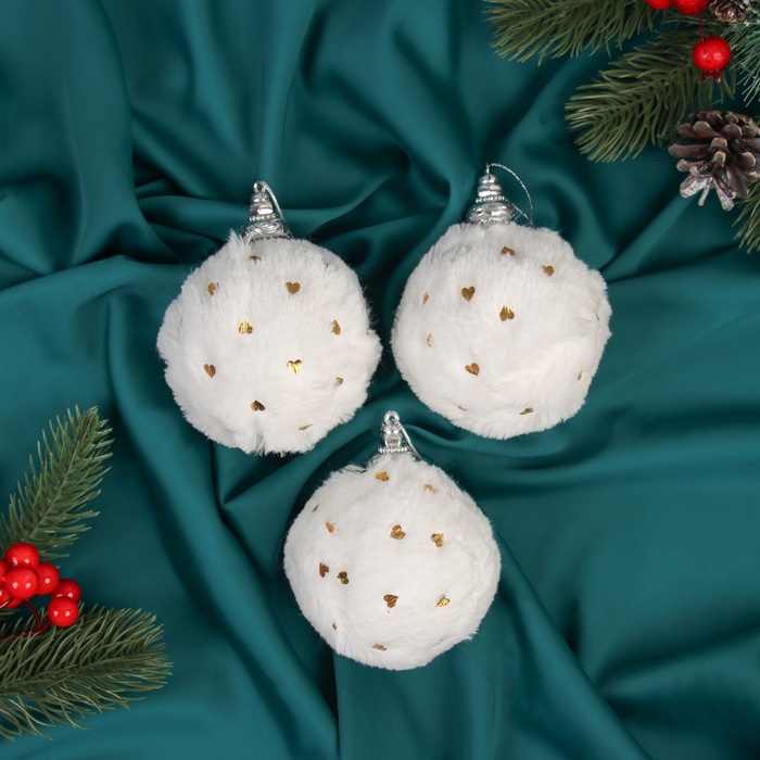Набор из трёх белых шаров с мягкой текстильной поверхностью и декоративными сердечками — лаконичное украшение для новогодней ёлки в скандинавском стиле. Их сочетание пластика и текстиля подчёркивает простоту и уют северной эстетики, создавая атмосферу спокойствия и тепла.