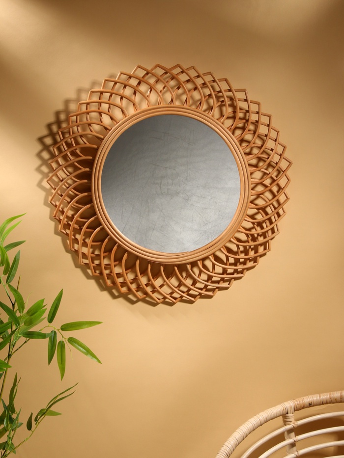 Круглое зеркало в ротанговой раме добавит уюта и естественного тепла в интерьер. Бежевый оттенок плетёного обрамления гармонично сочетается с большинством стилей — от прованса до современной классики. Стеклянная поверхность с чёткими гранями отражает свет, визуально расширяя пространство.